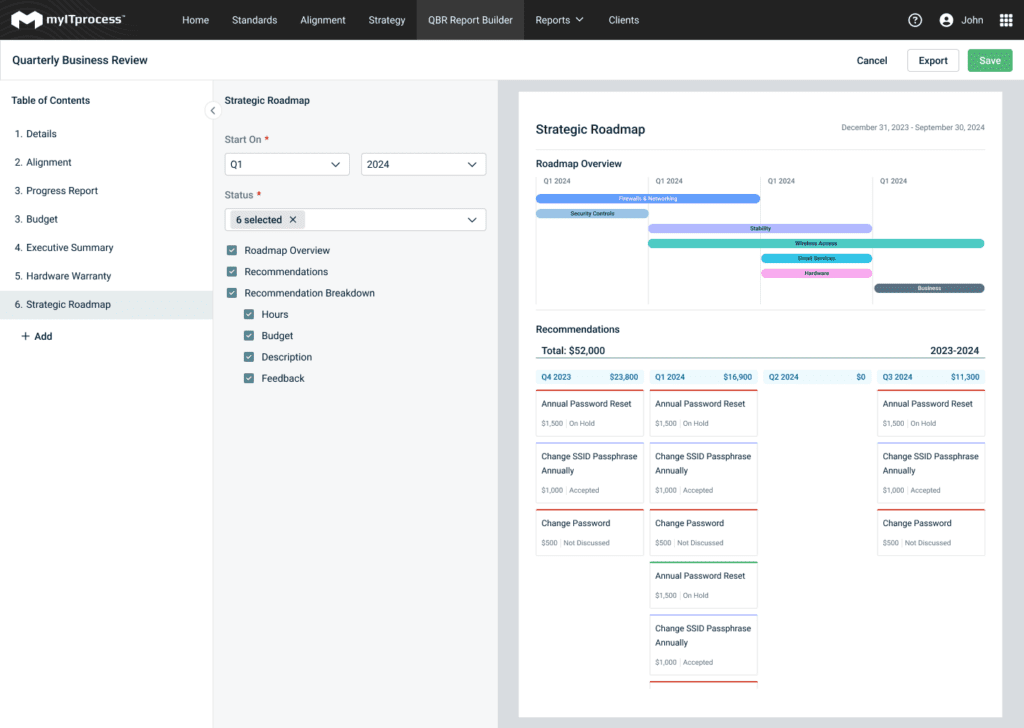 Sometimes, a client may request an impromptu meeting to get an update on ongoing projects or strategic plans. In such cases, MSPs often scramble to gather the required information in a limited timeframe. The QBR Report Builder has you covered. With readily available data in myITprocess, MSPs can quickly draft a report and enter the meeting fully prepared — even at a moment’s notice.