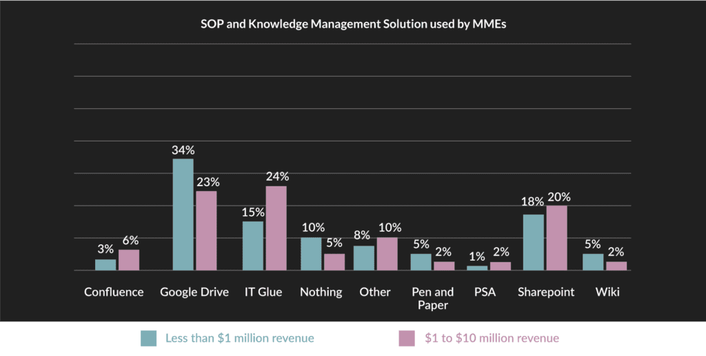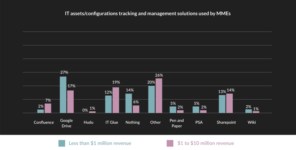 Our survey indicates that IT teams aren’t as consistent at keeping track of hardware and software assets as one might think. Despite the availability of automated asset management solutions, our analysis indicates that a vast majority of IT teams still use Google Workspace, SharePoint or nothing at all for asset management. They are still doing it the hard way. On the bright side, the adoption of structured solutions like IT Glue increases as organizations get bigger.