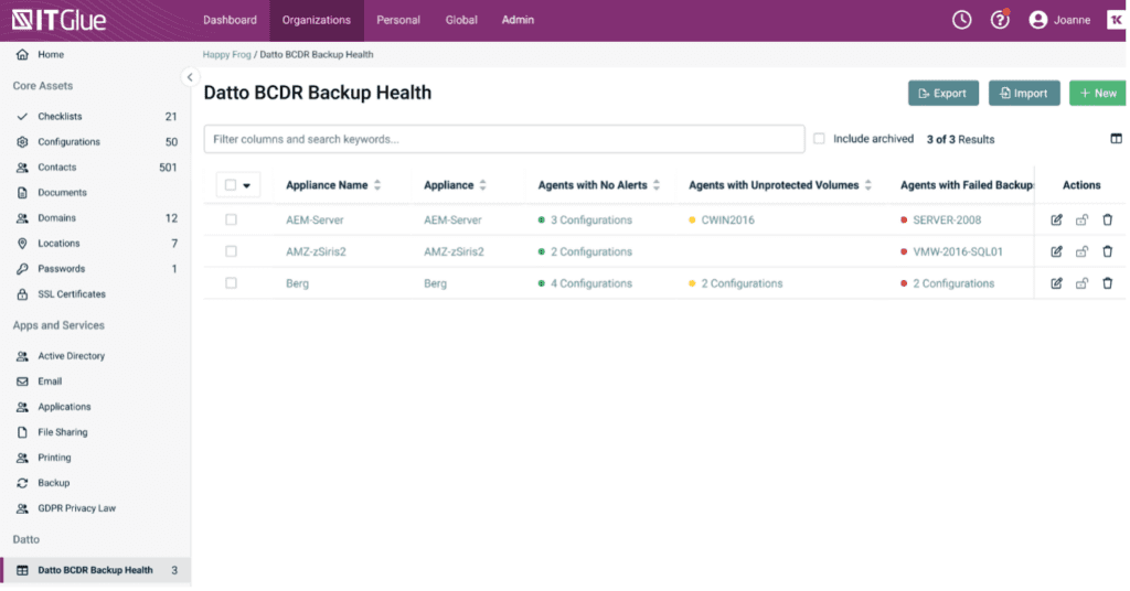 IT Glue is trusted by over 13,000 IT professionals as their single source of truth for all information in the IT environments they manage. With the growing number of IT Glue integration, you can have a consolidated view of your IT environment by bringing in important information from your tech stack including PSA, RMM, network monitoring, Microsoft and now Datto Continuity.