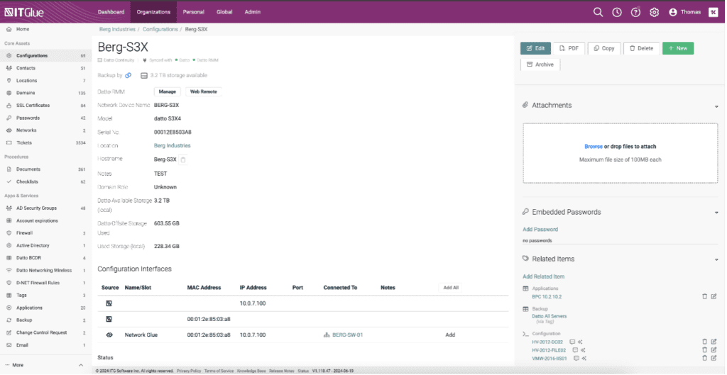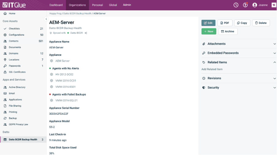 • Seamless documentation: This feature documents Datto BCDR appliances and their respective agents, which are automatically related as well. It also brings in critical backup information, such as total disk space used and last backup.