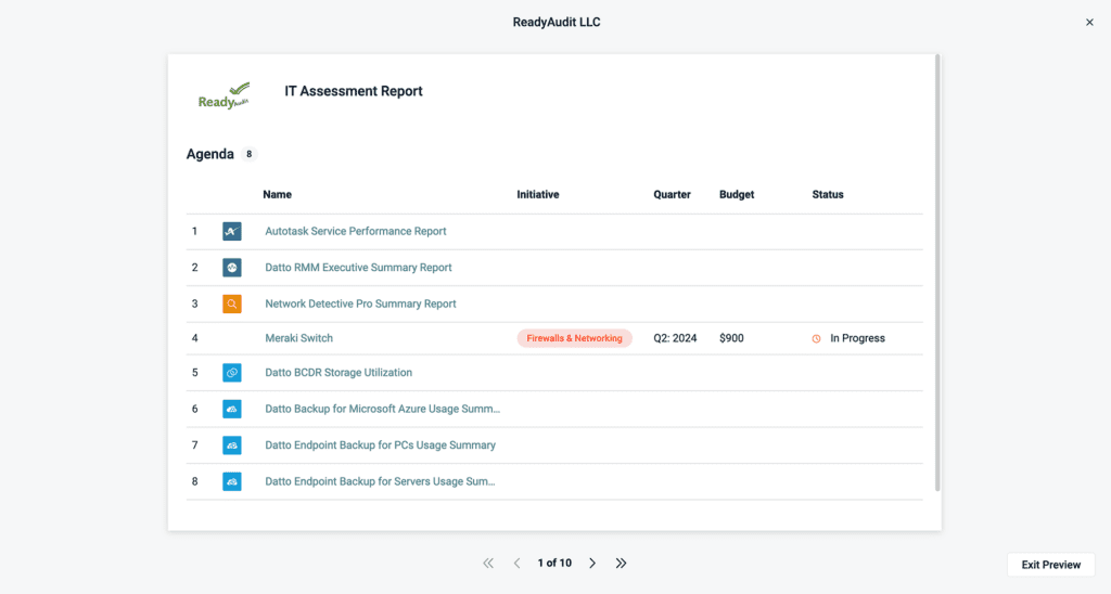 • NOW LIVE! Integrated Executive Summary: Consolidated reporting can transform your client presentations, save you time and ultimately, drive client satisfaction and business growth. With our latest feature, you can seamlessly include critical metrics from your core services and easily add these to your myITprocess presentations. Automatically include summary reports from Network Detective Pro, Autotask, Datto RMM and Datto Backup solutions in one pane directly in myITprocess, and easily present key stats of network risks, ticket resolution times and other insights on your service delivery performance. This feature will soon introduce summary reports from all IT Complete solutions, such as BMS, Graphus and more.