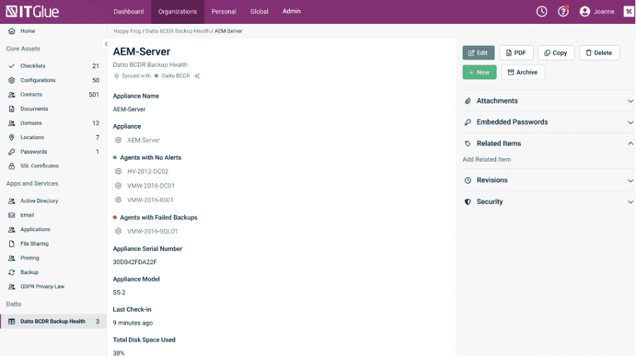 Consolidating IT information into a Flexible Asset template ensures all critical data for a specific concern is available in one organized view. This is especially useful for new technicians who are less familiar with the IT environments or for dynamic organizations with limited resources that struggle to keep large amounts of data organized. For example, instead of manually gathering backup health data from various sources, Smart Create automatically compiles it into a single, easy-to-navigate tab, enabling technicians to spot potential issues before they escalate.